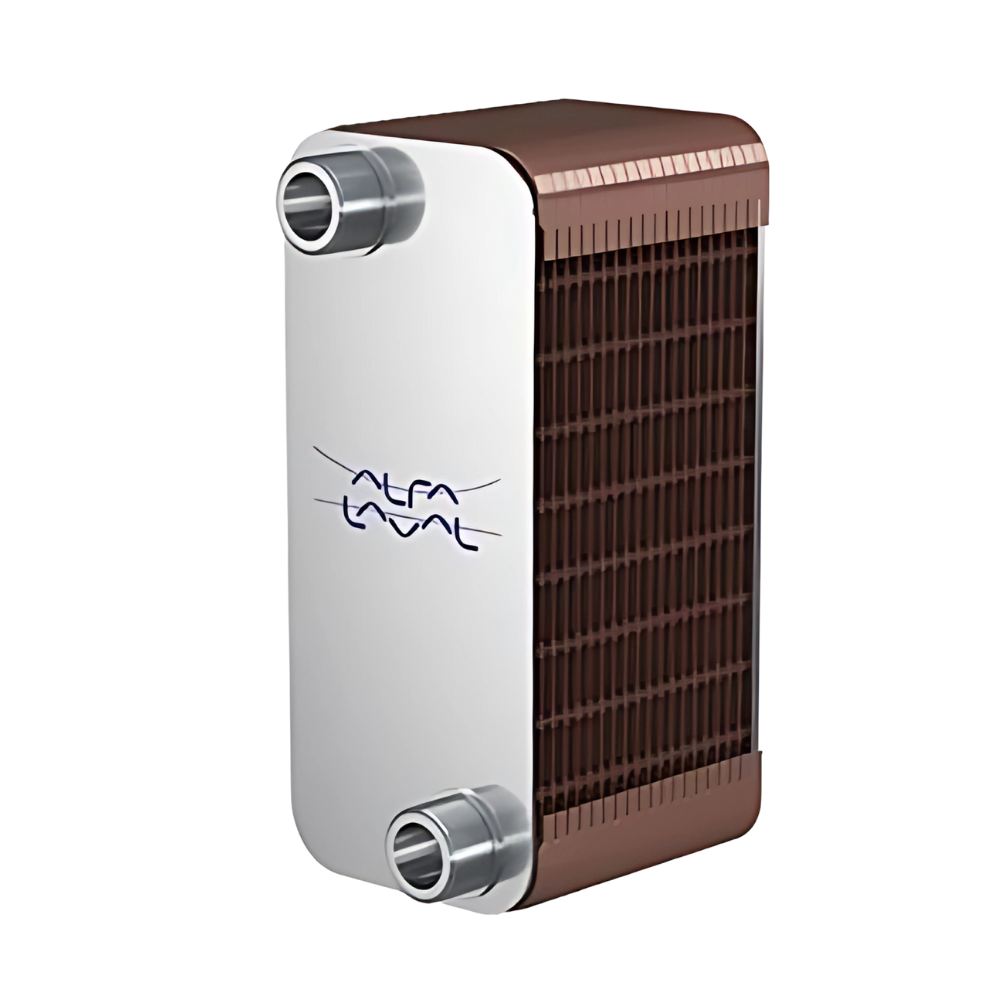 Alfa Laval gas-to-liquid heat exchangers use thin, corrugated stainless steel plates to provide heat transfer from one medium to the other. Copper brazing seals the media in the plate pack, resulting in a high-efficiency heat exchanger that consists solely of surfaces that actively contribute to heat transfer. Contact points between the plates are also brazed, which improves resistance to pressure and temperature fatigue.