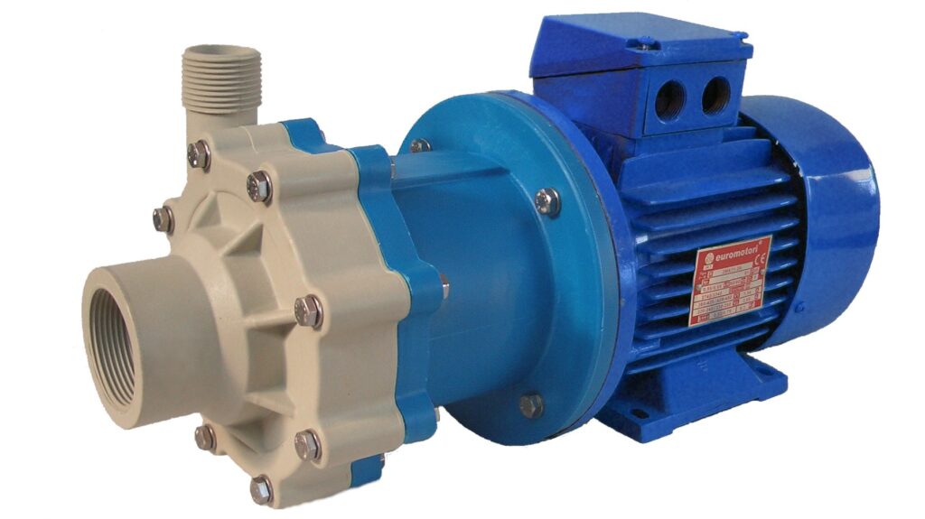 Horizontal, sealless PP and PVDF centrifugal pump with permanent magnet drive system, no mechanical seal.The separation of liquid chamber/ atmosphere by means of an isolation shell is the best solution to pump aggressive chemical, high purity liquids and liquids difficult to seal.